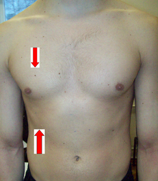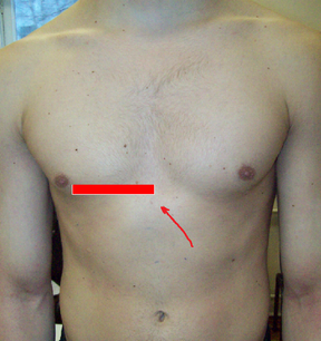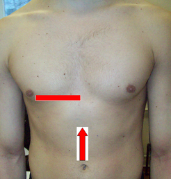 Разделив длинник пополам, проводим вертикальную линию и перкутируем по ней от подмышечной области к длиннику по межреберьям до притупления (3-я точка), затем от подвздошной ости к длиннику до притупления (4-ая точка).