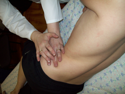 5. Ладонь левой руки с сомкнутыми и выпрямленными пальцами подкладывают в поперечном направлении под правую половину поясницы латеральнее свободного конца XII ребра.