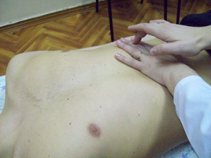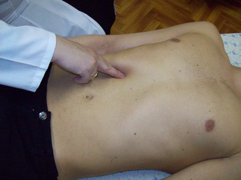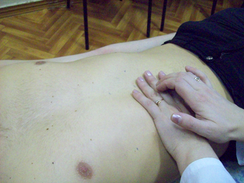 6. Во время выдоха погрузить пальцы правой руки в глубину брюшной полости.