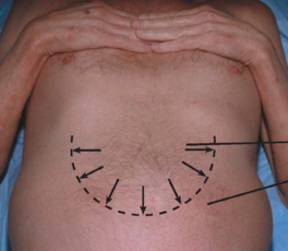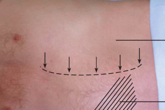 Для исключения возможности передачи толчков волнообразно по передней брюшной стенке помощник (или больной) надавливает ребром ладони на живот вдоль срединной линии в области пупка.