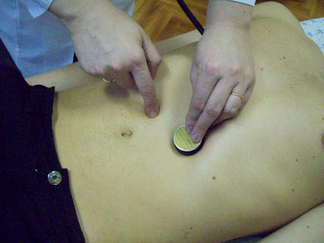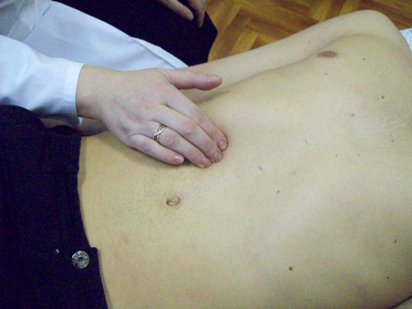 Установить пальцы рук с обеих сторон кнаружи от прямых мышц живота на 2-3 см ниже уровня большой кривизны желудка (рис. 46).