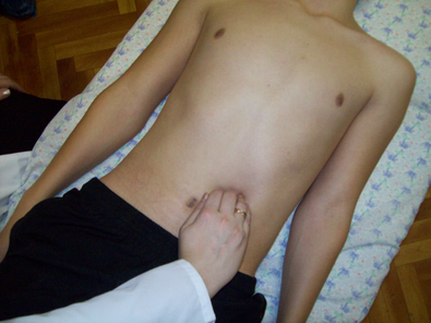 4. Погрузить пальпирующие пальцы во время выдоха в брюшную полость.