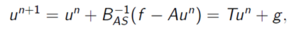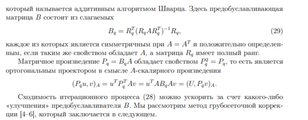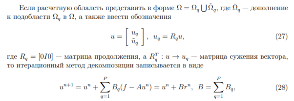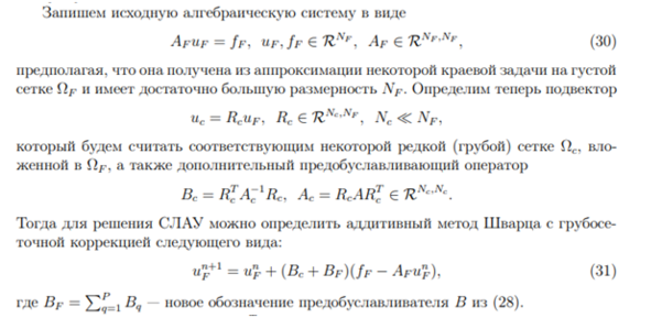 Хотим решать систему с помощью распараллеливания, поэтому матрицу А разбиваем на блоки {A_k_l} - блочные строки и блочные столбцы (например, квадратные блоки будут). Выбираем предобуславливающую матрицу B_AS (as = аддитивный метод шварца) = блочно-диагональная матрица (каждый блок A_kk соответствует задаче в k подобласти). Рассмотрим итерационный процесс: