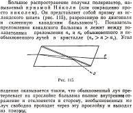 ри прохождении света через все прозрачные кристаллы кроме принадлежащих к кубической системе, наблюдается двойное лучепреломление: упавший на кристалл луч разделяется внутри кристалла на 2, распространяющиеся с разными скоростями в различных направлениях. Кристаллы, обладающие двойным лучепреломлением, подразделяются на одноосные и двуосные. У одноосных кристаллов один из преломленных лучей подчиняется обычному закону преломления – это обыкновенный луч. Для другого, необыкновенного луча отношение синусов угла падения и угла отражения не остается постоянным при изменении угла падения. У одноосных кристаллов (слюда, гипс) имеется направление, вдоль которого обыкновенный и необыкновенный лучи распространяются не разделяясь и с одинаковой скоростью – это оптическая ось. Любая пл через оптическую ось – главная пл или главное сечение кристалла.