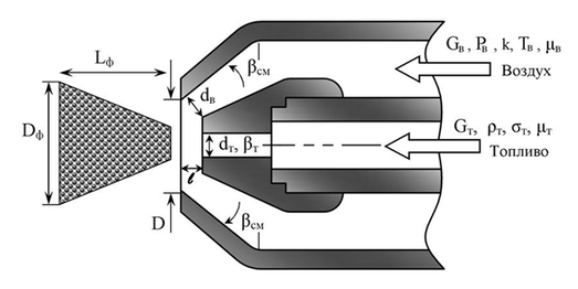 Сопло форсунки выполнено в виде коаксиального кольцевого канала, охватывающего цилиндрическое топливное сопло. Требования минимизации потерь давления и затрат энергии на организацию распыла объясняет часто встречающийся на практике выбор струйной системы подачи топлива, поскольку в этом случае напор в жидкостной магистрали необходим лишь для обеспечения переноса требуемого расхода к устью форсунки. Основную роль в процессе распыла играет кольцевая газовая струя, создающая эффект эжекции и условия дробления струи топлива на границе радела фаз, приводящие к распаду жидкости на капли. К числу характерных геометрических параметров форсунки, определяющих качество процесса распыла, отнесем диаметры воздушного dв и топливного dт каналов, диаметр канала смешения топливовоздушной смеси D, длину участка смешения l и корневой угол