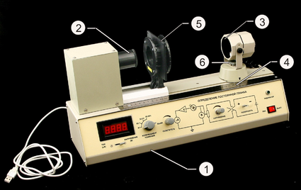 Лабораторная установка (рис. 1) состоит из металлического корпуса 1, на котором установлен объектив 2 фотоэлемента и осветитель 3. Лампа осветителя установлена на подвижной каретке, которая может перемещаться вдоль установки. За счёт этого можно изменять расстояние от источника света до линзы фотоприёмника. Это расстояние измеряется по линейке 4. Для фиксации осветителя в определённой позиции служит зажимный винт 6. Имеется комплект из 5 светофильтров, которые устанавливаются на фотоприёмник. Перед фотоприёмником установлена стойка 5 для крепления вращающихся поляроидов, которые служат для ослабления светового потока, падающего на фотоэлемент.