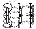Дано.- Схема зубчато-рычажного механизма (см. рис.21.3): слева - главный вид, посередине – вид сбоку; 1 – неподвижное, 2 и 3 подвижные зубчатые колёса; 4 – рычаг (иначе: водило), имеющий 3 оси вращения (О, А, В) для зубчатых колёс.