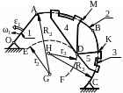 Пояснения.- О, А, В, С и D - вращательные пары; кривая АВ - это дуга окружности с центром в точке G и радиусом R2; кривая ВС - это дуга окружности с центром в точке H и радиусом R3. Тела 2 и 4, 3 и 5 имеют скользящие соединения,- такие, что: траекторией точки D относительно тела 2 является дуга DE окружности с центром в точке G и радиусом ; траекторией точки D относительно тела 3 является дуга DF окружности с центром в точке H и радиусом