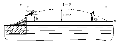м) расположения в начале полётной фазы центра масс механической системы «спортсмен-лыжи» над горизонтальной плоскостью, в которой этот центр масс окажется в момент касания лыж с водной поверхностью (см. рис.25.7).