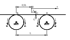 ПРИМЕР 25.5.- Доска на противоположно вращающихся барабанах. Силами трения растягивается - это пример на определение движения центра масс при силах, являющихся функцией координаты; характер движения неустойчивый. Вспомогательная значимость примера – показ на конкретном примере, что «подобия» и «похожести» по одним параметрам сопоставляемых систем (явлений, процессов и т.п.) далеко не всегда являются основаниями к утверждениям типа «да это тоже самое».