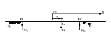 Требуется проанализировать движение доски - возможность схода её с барабанов. И, если анализ предскажет такое событие, то вычислить момент времени , в который центр тяжести С доски будет проходить через точку D (или В) её соприкосновения с барабаном.