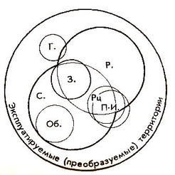 | Рис. 22. Схема взаимосвязи целей создания особо охраняемых территорий: Р – ресурсоохранные территории; 3 – запо-ведно-эталонные особо охраняемые территории; Рц – часть средообразующих и ресурсоохранных территорий, выделен-ная для целей рекреации, включая территории отдыха в культурных ландшафтах; П-И – часть средообразующих и ресурсоохранных территорий, выделенная в познавательно-информационных целях; С – средообразующие охраняемые природ-ные и природно-антропогенные территории; | |