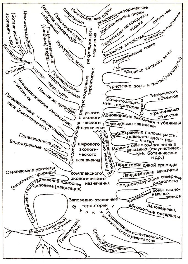 Рис. 23. Классификация (ветви дерева) и цели создания (корни дерева) природных и природно-антропогенных особо охраняемых территорий