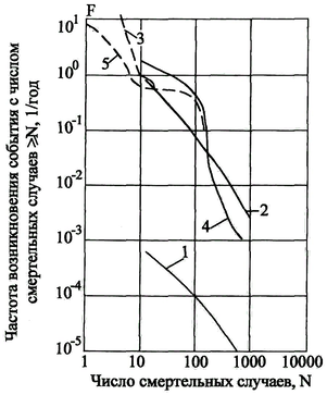 Групповой, или социальный, риск представляет собой зависимость между частотой происшествий (аварий, катастроф, стихийных бедствий) и числом пострадавших в них людей (рис. 3).