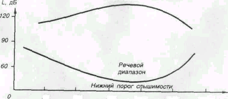 Слуховое восприятие изображается на диаграмме нанесением величин звукового давления, при которых на каждой частоте возникает ощущение звука, и обозначается как кривая порога слышимости (рис. 8).