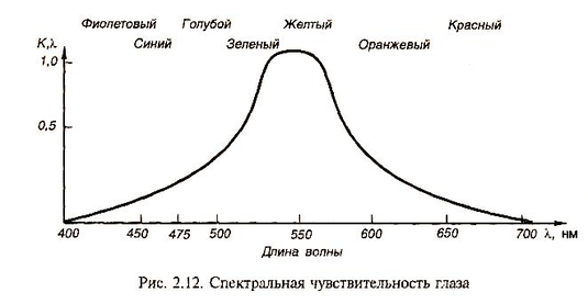 Приблизительные границы длин волн и соответствующие им ощущения показаны на рис. 7. Характеристикой чувствительности является относи-тельная видность – Кλ = Sλ/Smax, где Smax – ощущение, вызываемое источником излучения с длиной волны 554 нм; Sλ – ощущение, вызываемое источником той же мощности с длиной волны λ.