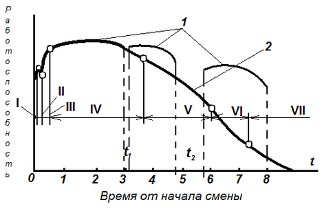 При отсутствии перерывов и пауз для отдыха работоспособность начинает резко убывать после своего пика примерно на третьем часу работы (кривая 2).