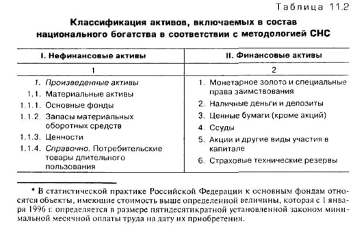 Все активы, включаемые в состав национального богатства, в соответствии с рекомендациями Статистической комиссии ООН подразделяются на две основные группы: нефинансовые и финансовые (табл. 11.2).