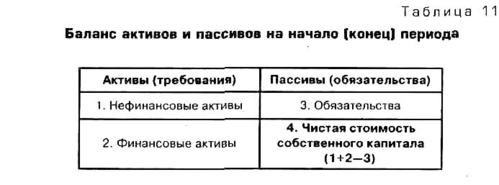 Расчет национального богатства и чистой стоимости собственного капитала для каждой хозяйственной единицы и секторов экономики отражается в специальных таблицах — в балансе активов и пассивов (табл. 11.1), который составляется по состоянию на начало и конец периода.