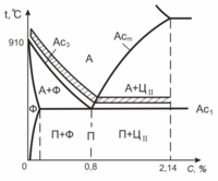 при понижении температуры диапазон растворимости углерода в аустените сужается (линии SG, SE) Перлит – эвтектоидная смесь феррита и цементита. Цементит – химическое соединение Fe3C (карбид железа) -