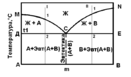 | 9) Диаграмма состояния сплавов 1 рода Оба компонента в жидком состоянии неограниченно растворимы, а в твердом состоянии нерастворимы (или ничтожно мало растворимы) и не образуют химических реакций. На этой диаграмме линия MСN – линия ликвидус, линия ДСЕ – линия солидус. Точки М и N – температуры плавления компонентов А и В. Диаграмма состояния сплавов с неограниченной растворимостью компонентов в твердом состоянии (2 рода) Линия M1N – линия ликвидус, линия M2N – линия солидус. Точки М и N – температуры плавления компонентов А и В Диаграмма состояния сплавов с ограниченной растворимостью компонентов в твердом состоянии (3 рода) Линия MEN – линия ликвидус, линия МДECN – линя солидус. Точки М и N – температуры плавления компонентов А и В. Точка Д – максимальная растворимость компонентов В в компоненте А. Точка С – максимальная растворимость компонента А в компоненте В. Точка Е – эвтектическая точка. | 10) Для анализа фазовых превращений широко используются правило фаз и правило отрезков. Правило фаз (закон Гиббса) описывается уравнением: С = К – Ф + 2, где С – число степеней свободы системы К – число компонентов (химических элементов), образующих систему. Ф – число фаз, находящихся в равновесии; 2 – число внешних факторов (температура и давление). Многие металлургические процессы проходят при постоянном давлении, чаще всего, атмосферном. В этом случае правило фаз упрощается: С = К – Ф + 1. Правило отрезков (правило рычага) позволяет определить химический состав фаз, находящихся в равновесии и соотношение между этими фазами. Используется для двухфазных областей диаграмм состояний. Позволяет для сплава заданного химического состава Х при определенной температуре найти: |