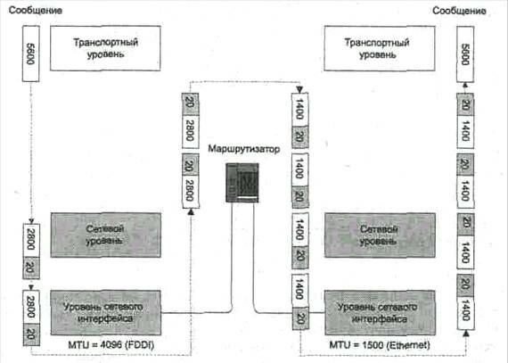 Когда маршрутизатор переправляет дейтаграмму из одной сети в другую, может оказаться, что ее размер окажется недопустимым в новой сети. Спецификация IP предусматривает следующее решение этой проблемы: маршрутизатор может разбить дейтаграмму на более мелкие фрагменты, приемлемые для выходной среды, а в пункте назначения эти фрагменты будут вновь объединены в дейтаграмму исходного вида. Формируемые маршрутизатором фрагменты идентифицируются смещением относительно начала исходной дейтаграммы. Дейтаграмма идентифицируется по отправителю, пункту назначения, типу протокола высокого уровня и 16-разрядному полю «Идентификатор». Все это в совокупности должно образовывать уникальную комбинацию.
