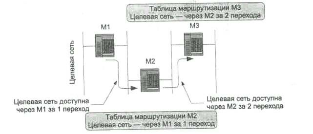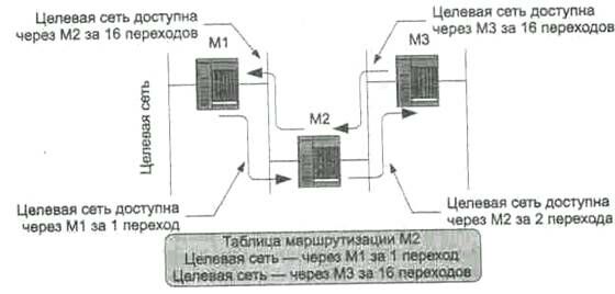 Например, маршрутизатор М будет устанавливать тайм-аут для своего маршрута в целевую сеть. Это заставит его, после обнуления таймера, сформировать сообщения об обновлении и посылать их через свои порты. Сообщения будут распространяться через все пути, обновляя метрику для целевой сети до бесконечности. Такой каскад сообщений об обновлении останавливается только тогда, когда он достигает маршрутизатора, который использует путь до целевой сети, не проходящий через маршрутизатор М.