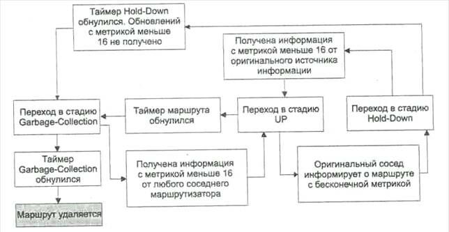 UP — маршрут достижим с определенной метрикой, меньшей 16. Маршрут остается в данном состоянии в течение шестикратного интервала времени между посылками сообщений об обновлении — это время называется таймером маршрута. Данный таймер сбрасывается каждый раз, когда поступает новое сообщение об обновлении этого маршрута. По обнулении таймера маршрут считается недействительным и переводится в состояние Garbage- Collection;