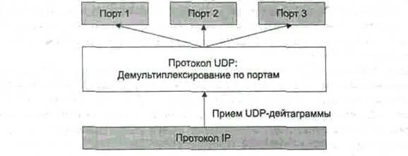 Протокол UDP принимает дейтаграммы от многих прикладных программ и передает их соответствующим прикладным программам на устройствах-получателях. Программное обеспечение UDP обеспечивает мультиплексирование и демультиплексирование дейтаграмм. Операционная система должна выделить каждой прикладной программе порт и сообщить ей его номер. После этого прикладная программа может посылать дейтаграммы с указанием номера прото­кольного порта. Протокол UDP принимает приходящие с уровня IP (в работе UDP принимают участие и сами дейтаграммы IP, см. выше) пользовательские дейтаграммы протокола UDP и демультиплексирует их по протокольным портам назначения. На рис. 11.4 показан пример демультиплексирования.