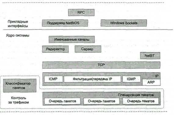 Кроме того, на уровень перегрузок, возникающих в сети, очень влияют правила транспортного протокола для передачи и повторной передачи данных. Протокол TCP активно используется и поддерживается большинством приложений, которые опираются на стек протоколов TCP/IP. Протокол TCP входит в состав транспортных протоколов, поддерживаемых операционной системой Microsoft Windows NT 5.0 (Windows 2000). На рис. 12.1 схематично показана сетевая модель этой операционной системы и место протокола TCP в ней.