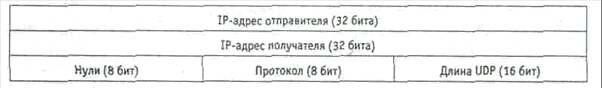 Контрольная сумма пользовательской дейтаграммы может вычисляться, а может и не вычисляться. Нулевое поле «Контрольная сумма» означает, что контрольная сумма не вычислялась. Контрольная сумма, как правило, не вычисляется при работе протокола UDP в высоконадежной локальной сети. Однако в ненадежной сети только контрольная сумма может указать на достоверность и целостность пришедших данных — ведь протокол IP не вычисляет контрольную сумму поля данных IP-дейтаграмм. Для расчета контрольной суммы пользовательской дейтаграммы необходима дополнительная информация. Для этой цели к началу пользовательской дейтаграммы приписывают псевдозаголовок и добавляют в конец этой дейтаграммы байт, заполненный нулями, так, чтобы число бит во всем сообщении было кратно 16. После этого вычисляется контрольная сумма полученной дейтаграммы. Концевое дополнение из нулей и псевдозаголовок не передаются вместе с пользовательской дейтаграммой. Для вычисления контрольной суммы полученной пользовательской дейтаграммы сначала сохра­няется ноль в поле «Контрольная сумма», затем вычисляется 16-битная сумма, включая псевдозаголовок, заголовок самой дейтаграммы и данных. При получении пользовательской дейтаграммы контрольная сумма должна проверяться. При этом используется IP-адрес назначения, полученный из заголовка IP-дейтаграммы, которая содержала пользовательскую дейтаграмму протокола UDP. Если контрольные суммы одинаковы, то пользовательская дейтаграмма действительно достигла нужного получателя и нужный протокольный порт на станции получателя. На рис. 11.2 показан формат псевдозаголовка.