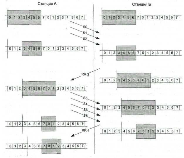 После получения подтверждения с такой информацией станция А считает себя вправе передать семь сегментов, начиная с сегмента S3. Кроме того, станция А может очистить свою буферную память от копий первых трех сегментов, так как они были успешно приняты. Теперь станция А передает сегменты S3, S4, S5 и S6. Станция Б в ответ на получение сегмента S3 отправляет подтверждение RR4 и позволяет производить передачу сегментов с номерами от S4 до S2 (этот сегмент относится уже к следующей последовательности из семи сегментов). На момент получения станцией А этого подтверждения сегменты S4, S5 и S6 уже были посланы и, следовательно, станция А может расширить свое окно и послать четыре сегмента, начиная с сегмента S7.