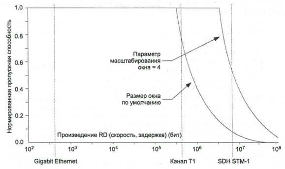 На рис. 12.9 показан пример определения максимальной пропускной способности в зависимости от произведения RD. Максимальный размер окна может составлять 216-l=65 535 байт. Такой размер окна должен быть достаточен для большинства приложений. В качестве примера давайте разберем три различные технологии, применяемые для передачи сегментов TCP и использующие такой размер окна. Для технологии Gigabit Ethernet с длиной магистрали, равной 100 м, произведение RD будет меньше, чем 103 бит. На больших расстояниях, пусть даже при более низких скоростях, например, в случае использования канала Т1 (1.544 Мбит/с), произведение RD становится большим, следовательно, эффективность падает. Тем не менее, она остается, как видно из рис. 7.9, приемлемой — около 0.8. На значительных расстояниях при дальнейшем увеличении скорости (допустим, речь идет о передаче информации с использованием технологии SDH (канал 155 Мбит/с) между двумя городами) рассматриваемая технология становится крайне неэффективной — как видим, нормализованная пропускная способность падает до 0.1. Очевидно, что в данном случае размер окна слишком мал. Необходимо использовать другой параметр масштабирования окна, который позволил бы эффективно задействовать пропускную способность канала. Достаточно увеличить параметр масштабирования окна до 4 — это приведет к значительному увеличению размера окна до 220-1 » 106 байт.