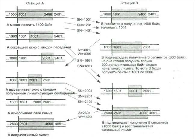 Для большей наглядности покажем поток данных, идущий только в одном направлении, и предположим, что в каждом сегменте посылаются 200 байт данных. Во время установления соединения номера в последовательностях отправителя и получателя синхронизированы и станция А имеет начальный лимит на отсылку данных 1400 байт, начиная с номера байта 1001. После посылки 600 байт в трех сегментах станция А уменьшает свое окно отсылки до 800 байт (номера с 1601 до 2400). После получения этого сегмента станция В подтверждает получение всех байтов, вплоть до 1601, и формирует свое окно приема на 1000 байт. Это означает, что станция А может посылать байты, начиная с номера 1601 и заканчивая номером 2600, то есть пять сегментов. Однако к тому моменту, когда сообщение от станции В доходит до станции А, последняя уже успела выслать два сегмента, содержащие байты 1601-2000, что позволял начальный лимит. Следовательно, оставшийся лимит станции А на этот момент составляет всего 400 байт или два сегмента. Во время обмена станция А продвигает левую границу своего окна каждый раз, когда осуществляет передачу. Правая граница передвигается только тогда, когда станция получает новый лимит.