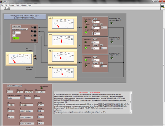 рехфазную нагрузку собирают из элементов блоков НАГРУЗКА В ФАЗАХ. Для проверки экспериментальных данных на лицевой панели расположен РАСЧЕТНЫЙ МОДУЛЬ.