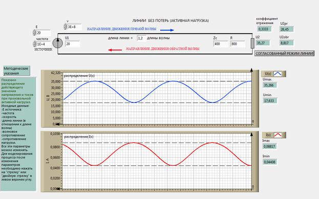 Согласованный режим в линии без потерь. Задать значения волнового сопротивления линии, длины линии и сопротивления нагрузки, равной волновому сопротивлению в соответствии с Таблицей 1 (опыт 1-6). Для каждого режима запустить ВП нажатием левой кнопки мыши (ЛКМ) на иконку