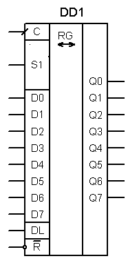 Рис.4.21.УГО регистра сдвига с параллельной загрузкой по команде DL , последовательной загрузкой по команде S1 и сбросом по R = 0.