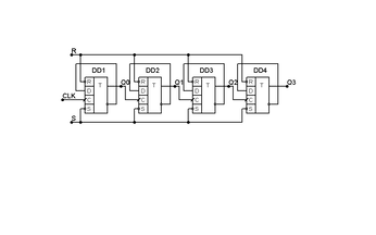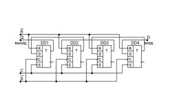Информационный сигнал поступает на D вход левого триггера DD1 и по фронту импульса синхронизации записывается в этот триггер, оказываясь через время задержки триггера DD1 на D входе второго триггера DD2. Следующий импульс синхронизации сдвигает информацию еще на один разряд вправо.
