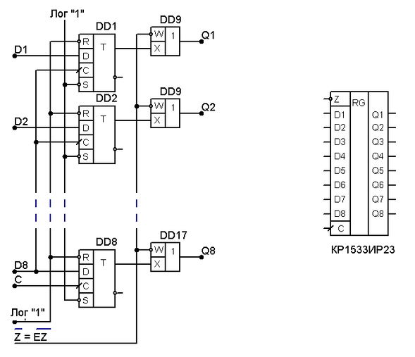 Описание восьмиразрядного регистра(nbgf BH23) с синхронизацией по фронту синхросигнала С и выходами с тремя состояниями и управляющим асинхронным сигналом EZ.