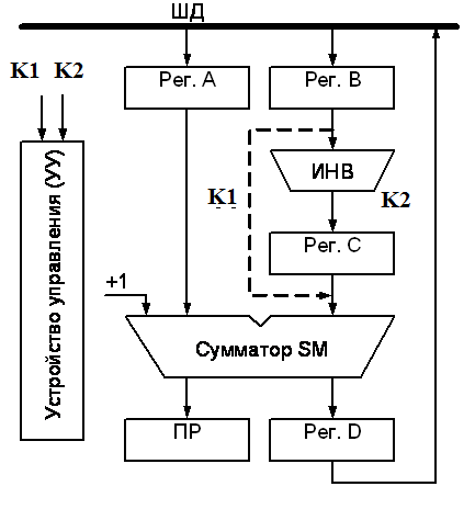 Функциональная схема АЛУ для сложения и вычитания чисел с фиксированной запятой представлена на следующем рисунке