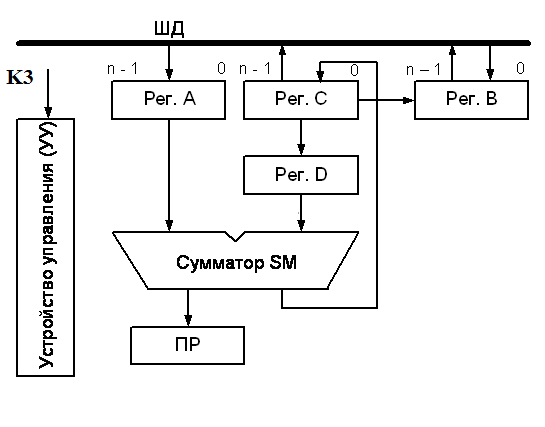Регистры подсоединены к Шине данных (ШД) компьютера. На входы Устройства управления (УУ) подаются команды: K1 – "сложение", K2 – "вычитание".