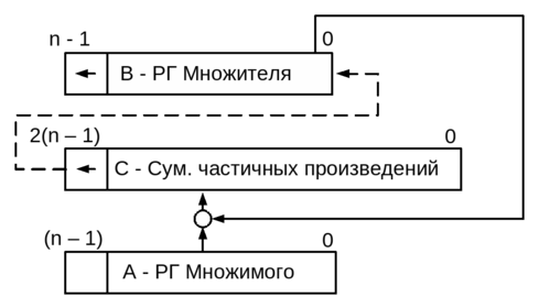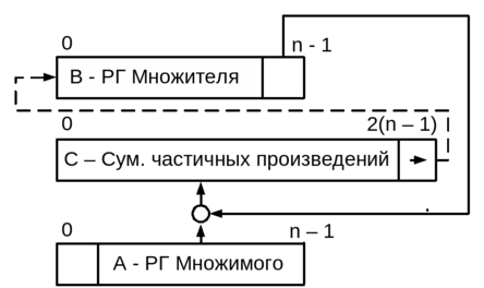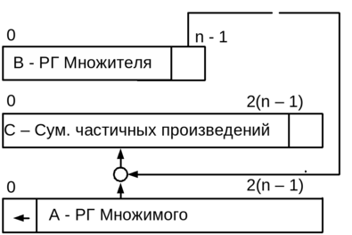 АЛУ для умножения содержит три регистра: регистр А для множимого, регистр В для множителя и регистр С для сумм частичных произведений. Разрядность регистра В равна разрядности числа (n), разрядности регистров А и С – 2n. В состав регистра С входит комбинационный сумматор.