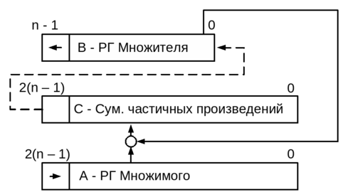 Умножение проводится за n тактов, начиная со старшего разряда множителя. На каждом такте число в регистре А сдвигается вправо на один разряд. Если в соответствующем разряде числа множителя (регистр В) единица, то число из регистра А передается в регистр С и складывается с суммой частичных произведений. Иначе число из регистра А в регистр С не передается. Результат умножения получается в регистре С.