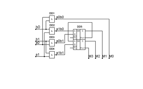 Суммирование проводится в двух одноразрядных сумматорах. Результат умножения появляются на выходах М3, М2, М1 и М0.