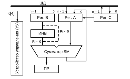является дополнительным кодом делителя В, у которого предварительно изменили знак. Таким образом, здесь представлена удобная для схемотехнической реализации операция вычитания