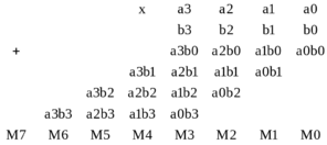 Перемножим два четырехразрядных числа А = a3, a2, a1, a0 и B = b3, b2, b1, b0 столбиком. [не информативное представление матрицы]