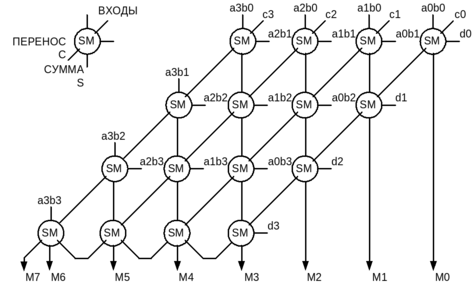 Двухвходовые логические элементы "И" на этой схеме не показаны. Их выходы подключены к входам сумматоров. Частичные суммы произведений суммируются в вертикальных столбцах, по наклонным линиям передаются переносы. Входы di справа служат для подключения аналогичной схемы при расширении разрядности.