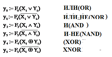 Схема поразрядного блока логических операций, выполняющего перечисленные логические операции, показана на следующем рисунке