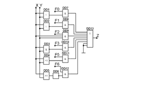 На входы X и Y подаются одинаковые разряды входных операндов. Вид выполняемой над ними логической операции выбирается путем подачи лог. 1 на соответствующий вход Fi. Результат логической операции появляется на выходе Z.