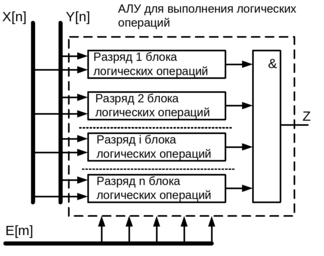 АЛУ содержит n блоков поразрядных логических операций. На вход каждого блока подается соответствующие разряды двух входных операндов X и Y. На управляющие входы АЛУ подается вектор Е, выбирающий одну из логических операций, выполняемых над операндами X и Y. Результат вычислений поступает на выход АЛУ Z.